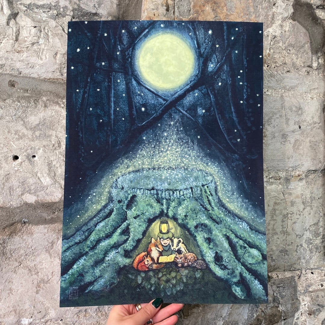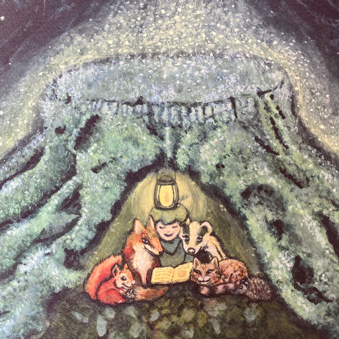 Inspired by folklore, forests and wildlife, this Giclee print taken from an original painting – with a cosy scene that expresses warm feelings of friendship, connection and community. Where forest Sprites and friendly furry friends, from different parts of the forest, curl up together to share stories and snuggle under a blanket of warm leaves. Nourishment can come in many forms, not just through rest and the food we eat – but also through the company we keep.