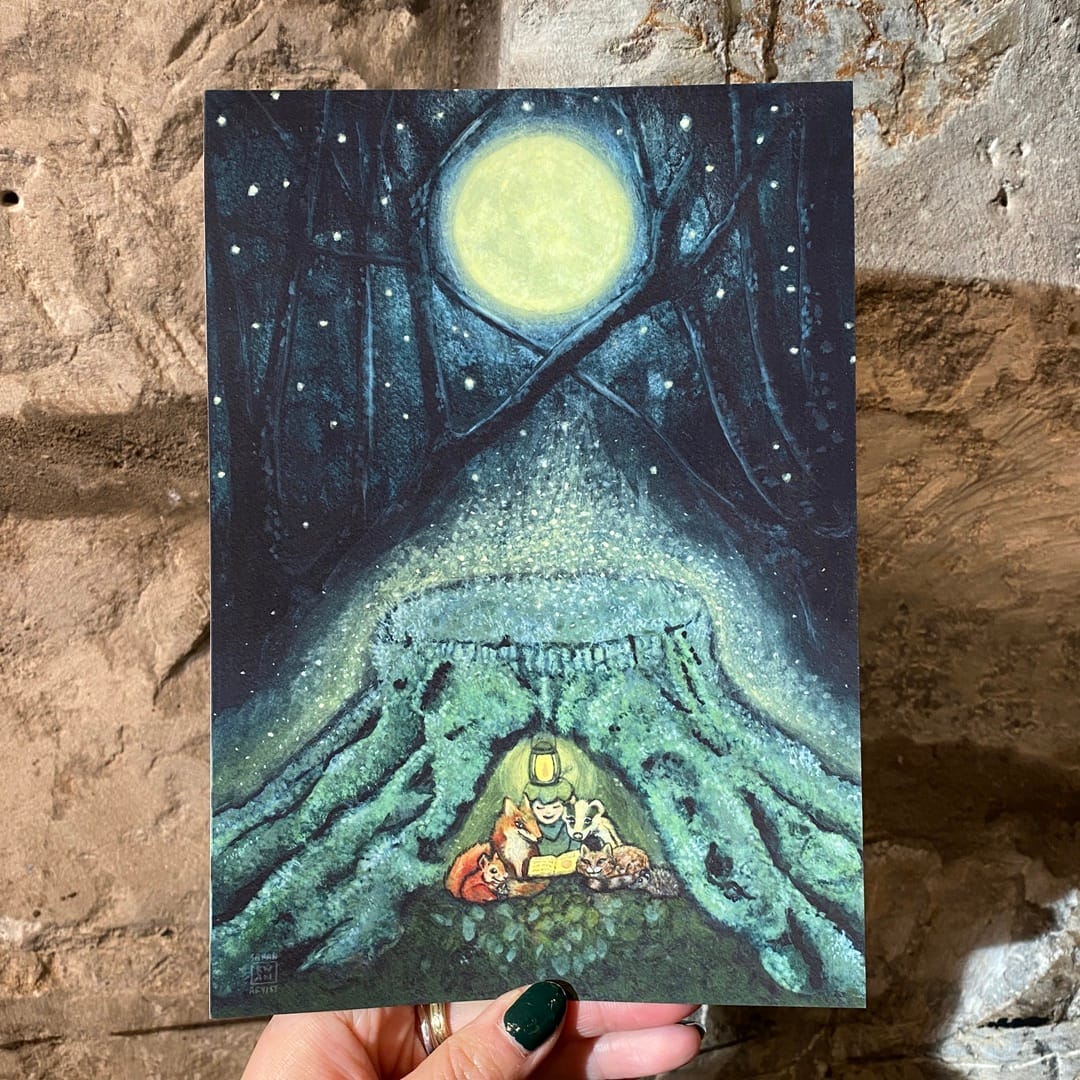 Inspired by folklore, forests and wildlife, this Giclee print taken from an original painting – with a cosy scene that expresses warm feelings of friendship, connection and community. Where forest Sprites and friendly furry friends, from different parts of the forest, curl up together to share stories and snuggle under a blanket of warm leaves. Nourishment can come in many forms, not just through rest and the food we eat – but also through the company we keep.