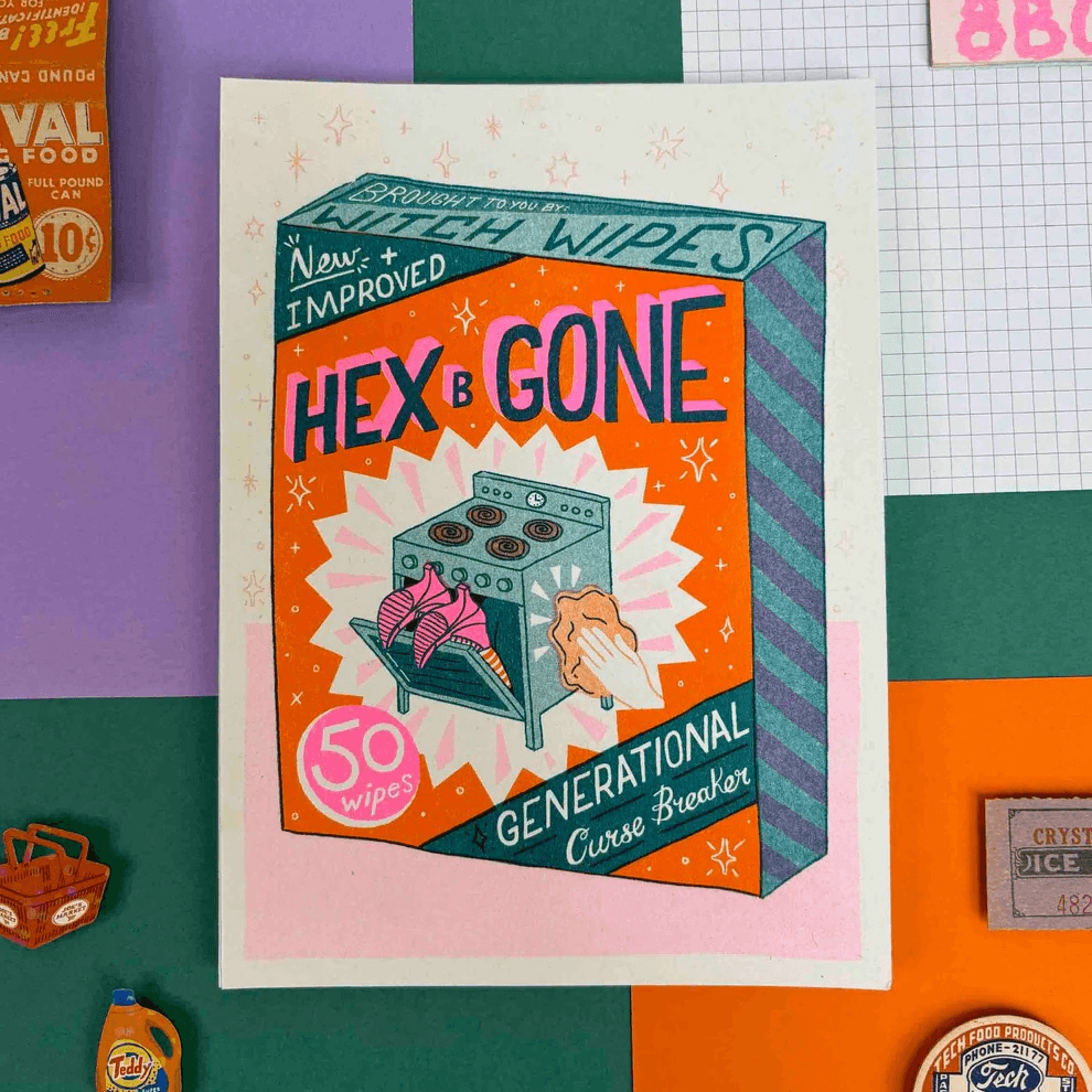 Hex-B-Gone draws on the language of mid-century ephemera, taking the familiar aesthetics of domesticity and twisting them. Here domestic rebellion is rife; generational curses are broken and kitchens that once symbolised duty, are a site of resistance where witches stir up more than just soup.