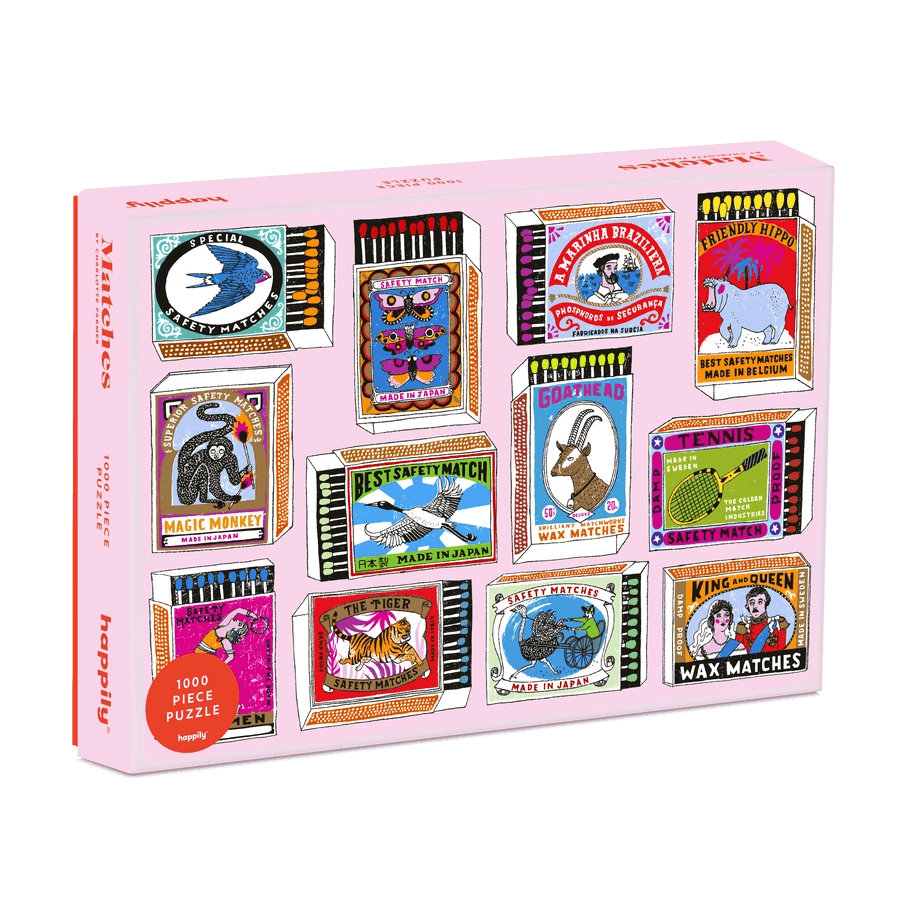 1,000 piece puzzle featuring illustrations of vintage match boxes by acclaimed illustrator Charlotte Farmer.