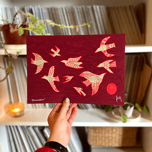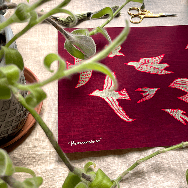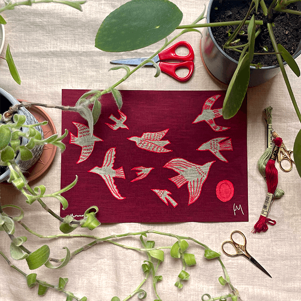 Inspired by the beautiful undulating shapes of starlings as they migrate, “Murmuration” is is for the bird lovers. Flocking and swirling in the sky, these bird motifs are inspired by traditional folk art and were originally embroidered as a textile wall hanging. This A4 gicleé print replicates the texture of the fabric and stitch beautifully, creating the illusion of a real textile artwork. Pop it in a frame to complete the illusion.
