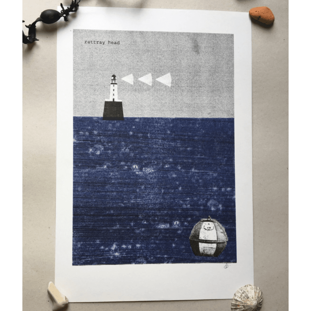 Two colour risograph print inspired by Rattray Head lighthouse.