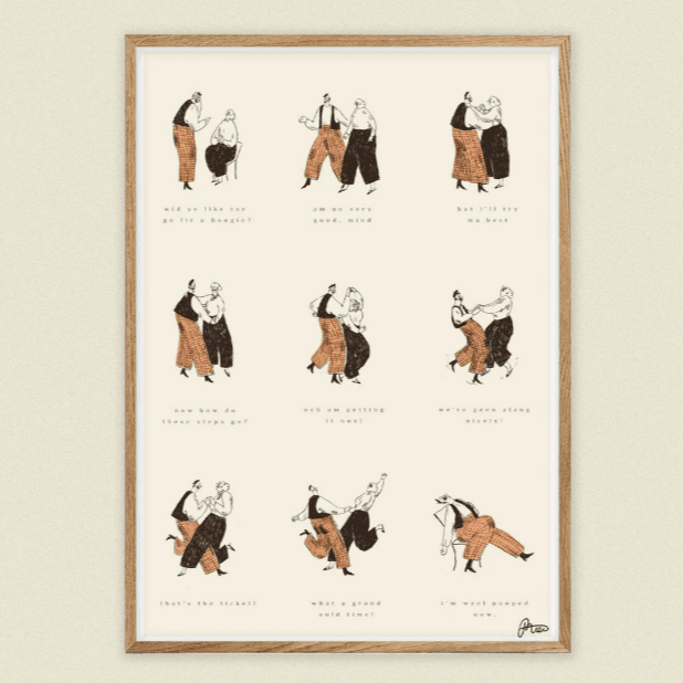 Go Fir A Boogie’ is a playful story of two people finding the courage to go for a little dance. Inspired by ceilidhs and the Scottish dance-halls of the 1950s, this print shows those few moments when you’re trying to remember how the dance actually goes.